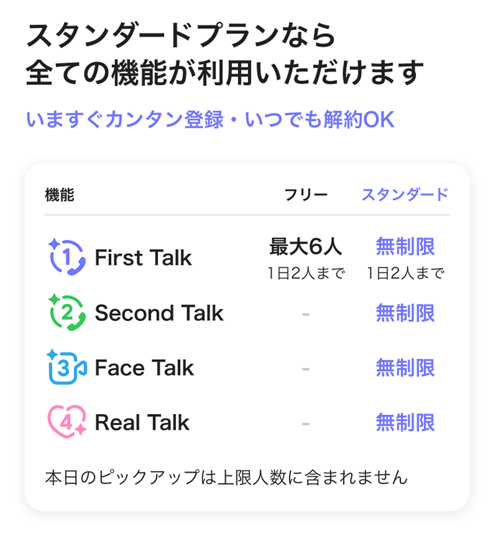 | First Talk | 1日2名まで(最大6人) | 1日2名まで(無制限) |